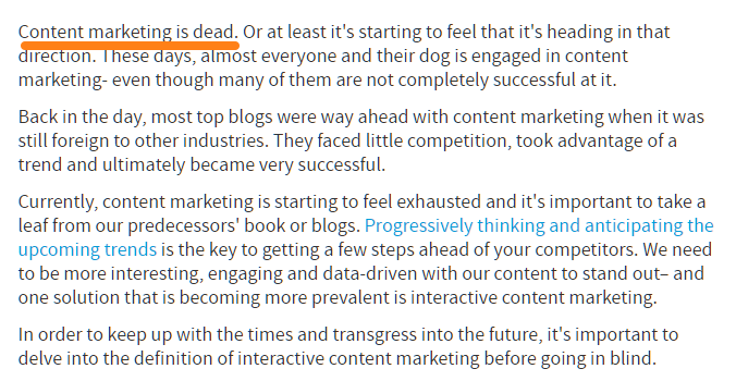 文章第一句话就是 「内容营销已死」! 这种与我们惯有认知相背的声明是否会立刻引发你的好奇心激发你继续阅读下去?